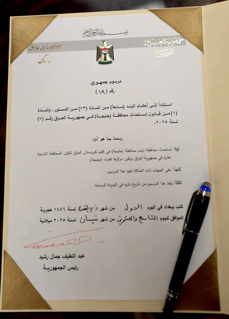 Piştî îmzeya Serokomarê Êraqê (Dr. Letîf Reşîd) bajarê Helebçe wê bi fermi bibe parêzgeha 19emîn a Êraqê û çaremîn parêzgeha Herêma Kurdistanê.