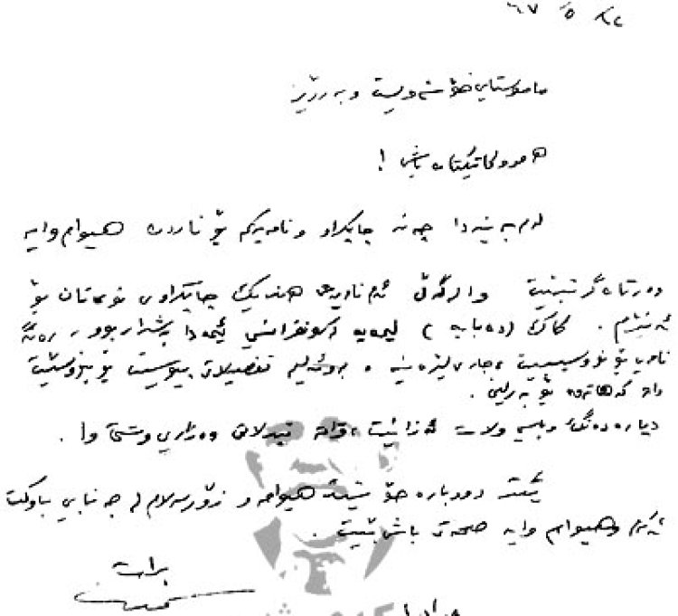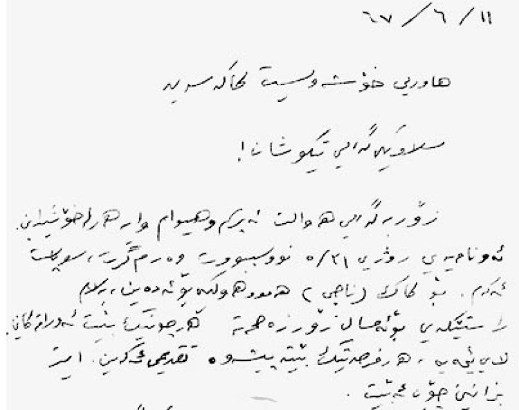 Ez pir bi germî silavan li we dikim û hêvî dikim ku hûn xweşiyê de bin. Min ev nameya ku we nivîsandiye di 31/5an de wergirt, spas dikim. Em ê ji bo kak (Nacî) emê hemû hewlekê bidin, lê rastî ji bo îsal dê pir zehmet be, belgeyên wî li cem me ne di her derfetek ku çêbibe emê pêşkêş bikin, ka em bibînin ka ew çawa dibe. kak Debaba li van deran bû, ew ev demeke vegeriyaye, ez nizanim wî name ji we re nivîsî yan na.)