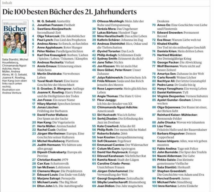 New Zurichscher Zeitung li herêma Almanîaxêv û bi giştî li Ewrûpayê wekî lîsteyek paralel bi New York Times re tê hesibandin, ku her du jî girîngiya cîhanî ne.